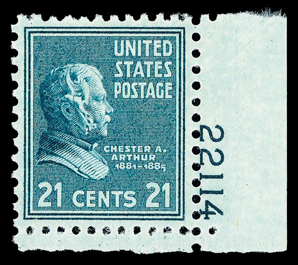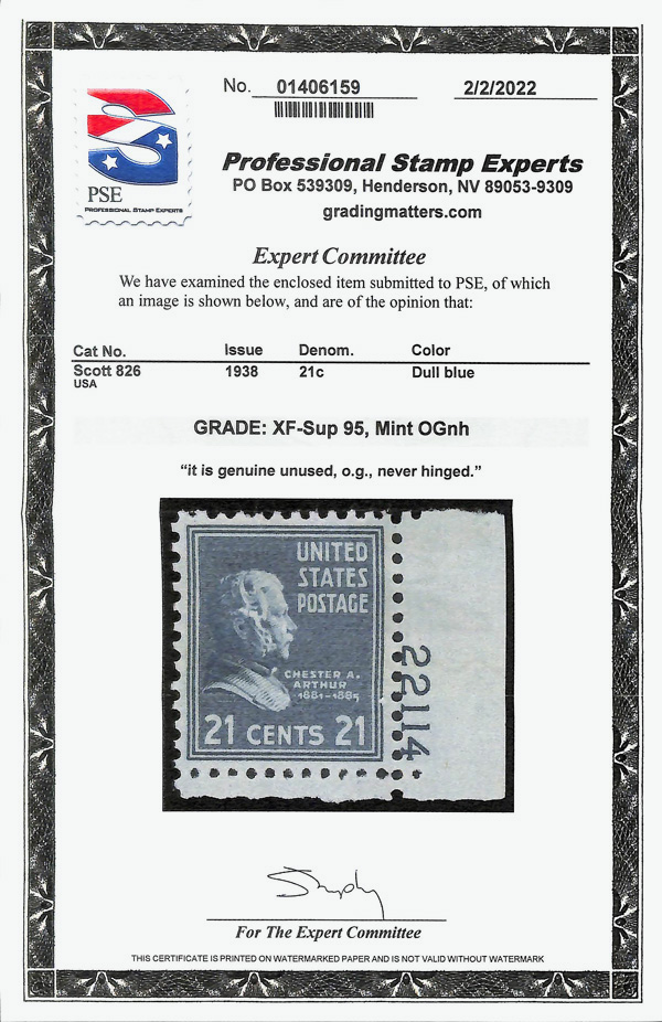9191 nh 826 image1938, Presidential Issue, 21¢ Chester A. Arthur (Scott 826), single, o.g., never hinged, Superb, with 2022 P.S.E. certificate graded XF-SUP 95.