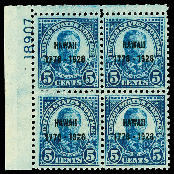 9164 nhbl 648 image1928, 5¢ Hawaii (Scott 648), top left plate block of 4 with plate number 18907, Bold, confident color presence, o.g., never hinged, Very Fine.