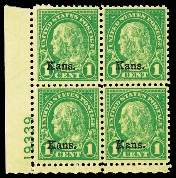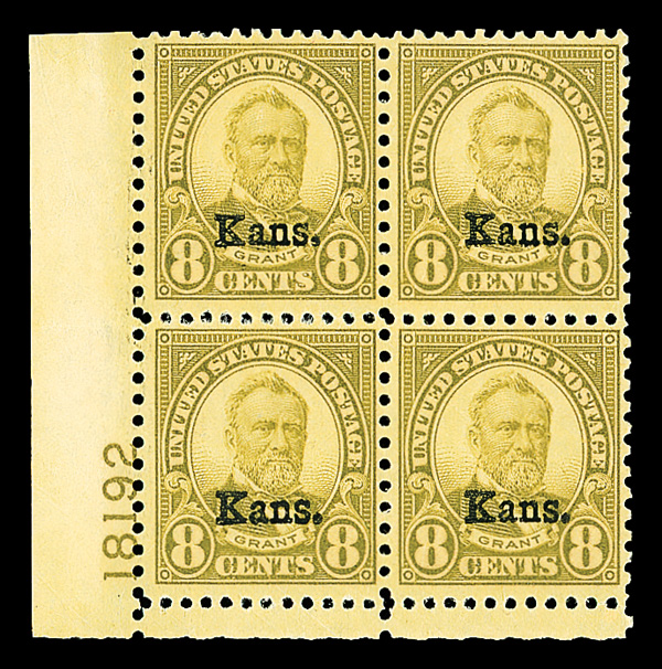 9177 nhbl 668 image1929, 10¢ Kans. (Scott 668), top right plate block of 4 with plate number 19235, Crisp and freshly vivid, left stamps very well centered, o.g., never hinged; perf separation at top, Fine to Very Fine.