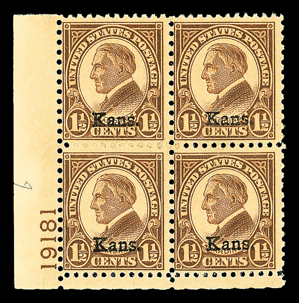 9168 nhbl 659 image1929, 1½¢ Kans. (Scott 659), bottom left plate block of 4 with plate number 19181, Clear, vivid shading that really shines, o.g., never hinged; gum disturbance spot on top left stamp, Fine.