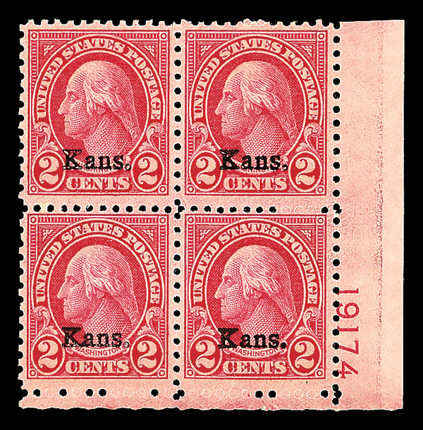 9169 nhbl 660 image1929, 2¢ Kans. (Scott 660), bottom right plate block of 4 with plate number 19174, Soft yet vivid color that remains wonderfully fresh, o.g., never hinged, Fine to Very Fine.