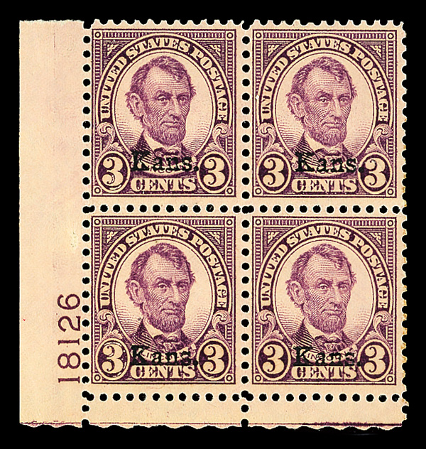9170 nhbl 661 image1929, 3¢ Kans. (Scott 661), bottom left plate block of 4 with plate number 18126, Color that remains bright and solid throughout, o.g., never hinged, Fine to Very Fine, with 2021 Crowe certificate.