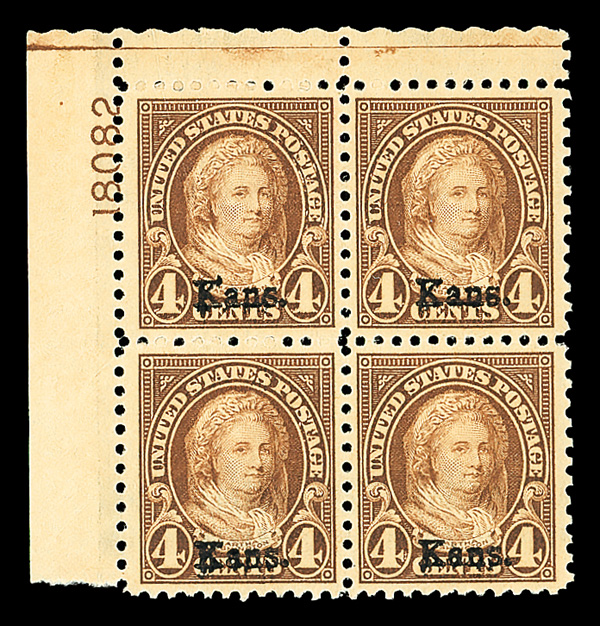 9171 nhbl 662 image1929, 4¢ Kans. (Scott 662), top left plate block of 4 with plate number 18082, Impressively fresh tone, o.g., never hinged, Very Fine.