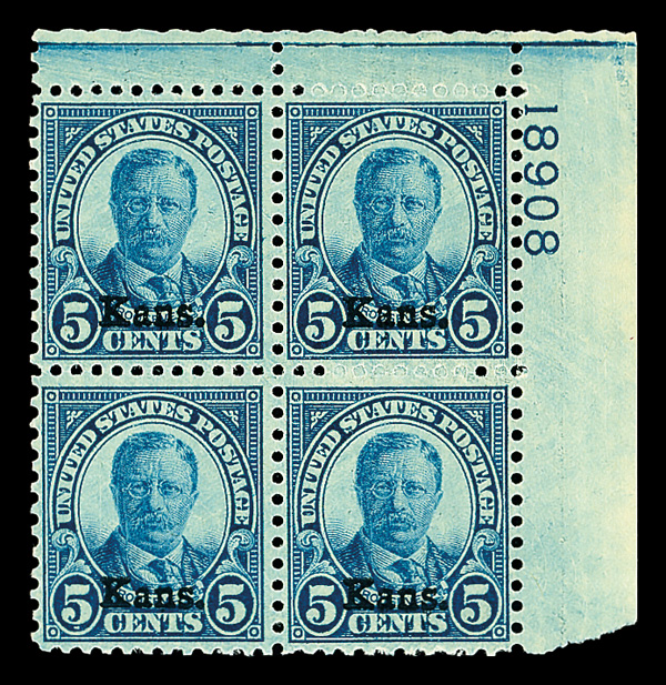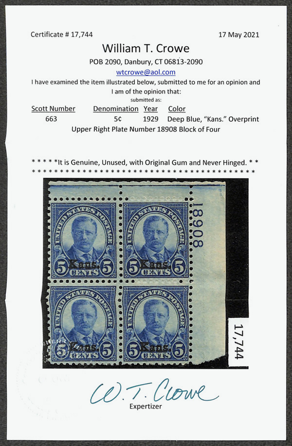 9172 nhbl 663 image1929, 5¢ Kans. (Scott 663), top right plate block of 4 with plate number 18908, Fresh and full-bodied, o.g., never hinged, Fine, with 2021 Crowe certificate.