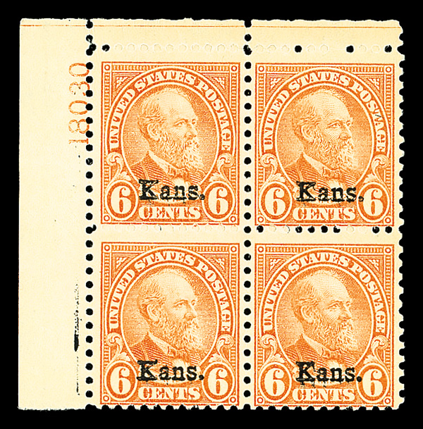 9173 nhbl 664 image1929, 6¢ Kans. (Scott 664), top left plate block of 4 with plate number 18030, Refreshingly strong tone, o.g., never hinged, Fine.