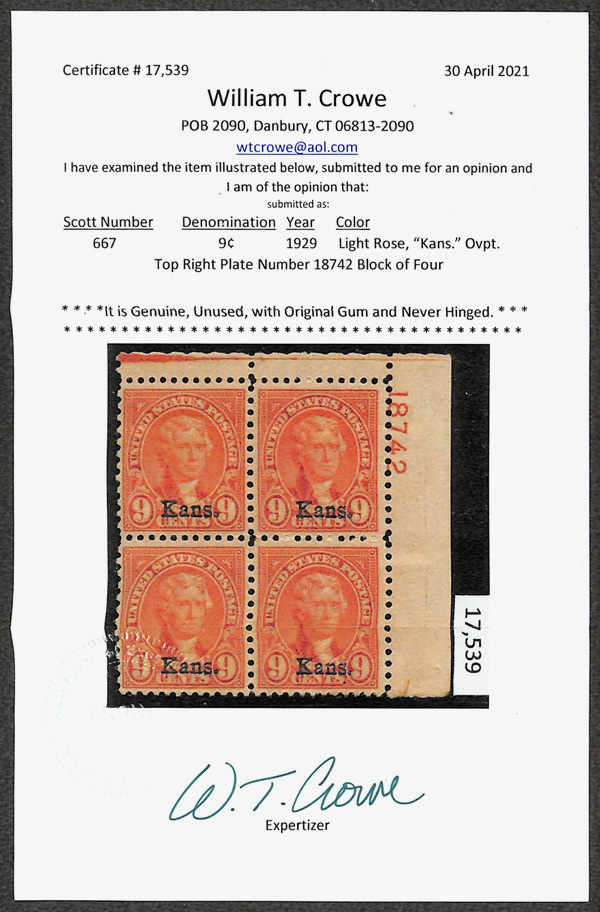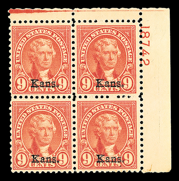 9176 nhbl 667 image1929, 9¢ Kans. (Scott 667), top right plate block of 4 with plate number 18742, Fresh, lively color, right stamps very well centered, o.g., never hinged, Fine to Very Fine, with 2021 Crowe certificate.