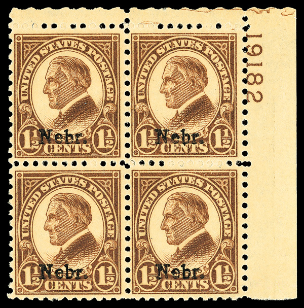 9178 nhbl 670 image1929, 1½¢ Nebr. (Scott 670), top right plate block of 4 with plate number 19182, Fresh, defined color, o.g., never hinged, Fine to Very Fine.