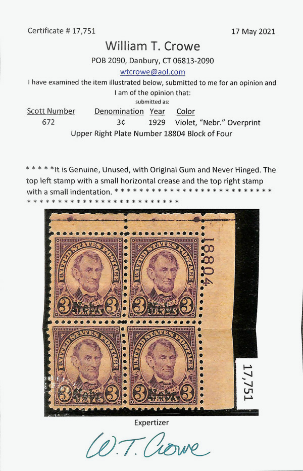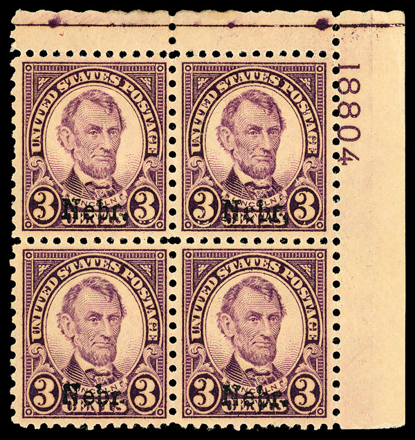 9179 nhbl 672 image1929, 3¢ Nebr. (Scott 672), top right plate block of 4 with plate number 18804, Fresh and confidently bright, o.g., never hinged; small horizontal crease on top left stamp and small indentation on top right stamp, Fine to Very Fine, with 2021 Crowe certificate.