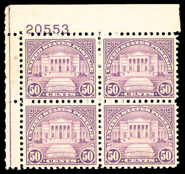 9186 nhbl 701 image1931, 50¢ Arlington Amphitheater, rotary press printing (Scott 701), top left plate block of 4 with plate number 20553, Clean, lively color throughout, o.g., never hinged; light wrinkles in top selvage and top left stamp, Very Fine.
