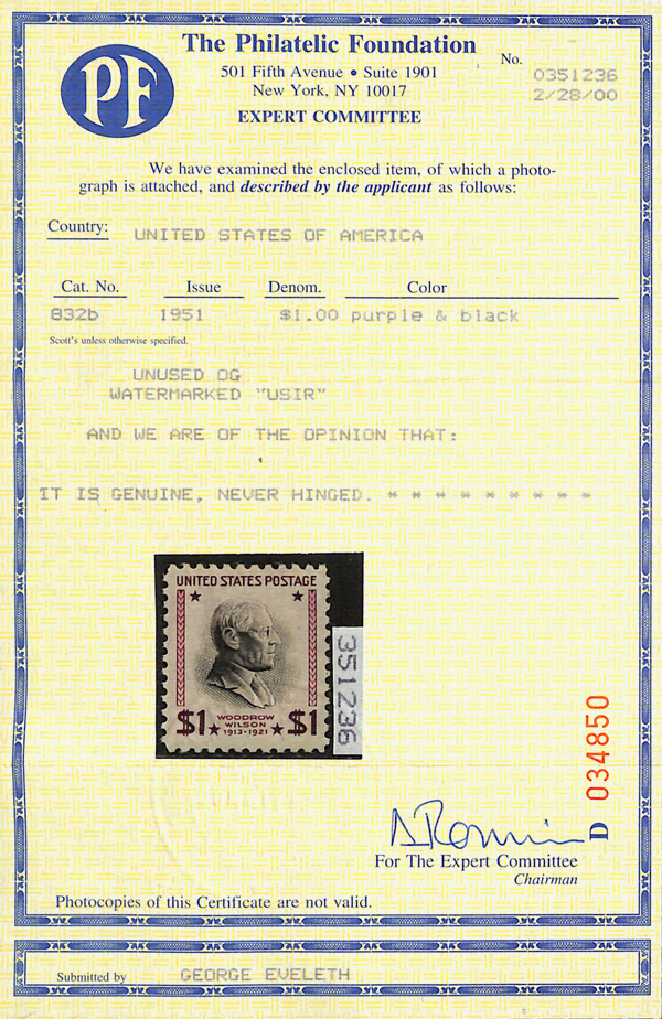 9193 nh 832b image1951, Presidential Issue, $1 Wilson, watermarked USIR (Scott 832b), o.g., never hinged, wonderfully fresh with crisp color and detail on lily-white paper, Very Fine, with 2000 P.F. certificate.