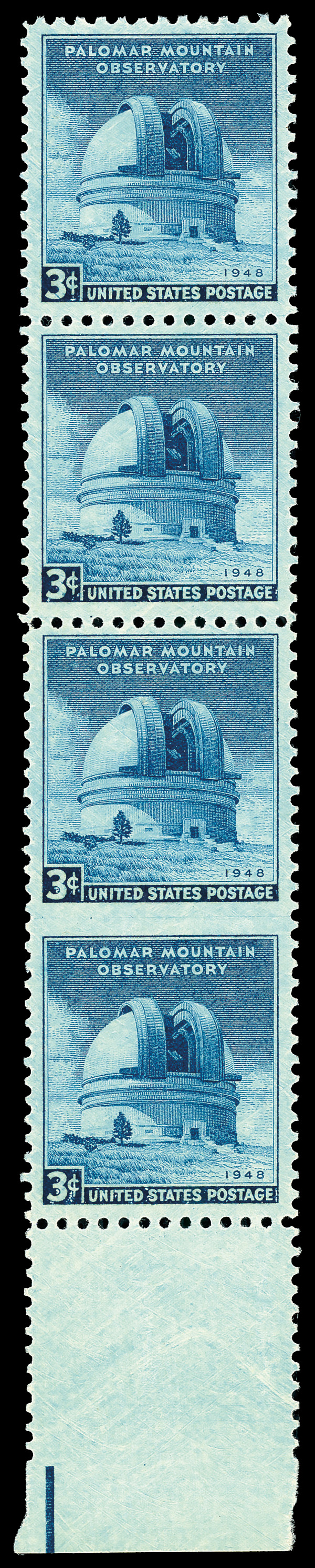 9200 nh 966a image1948, 3¢ Palomar Observatory, vertical pair, imperf. between (Scott 966a), the bottom two stamps of a bottom margin vertical strip of four, fresh and clean; diagonal gum bend on lower stamp, o.g., never hinged, otherwise Very Fine.