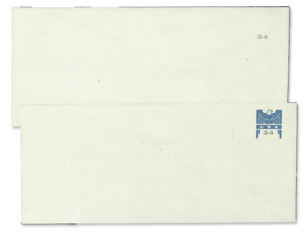 9318 og U646a imageEnvelope, 2001, 34¢ Eagle, blue gray omitted (Scott U646a), entire, with a normal example, o.g., never hinged, Extremely Fine.