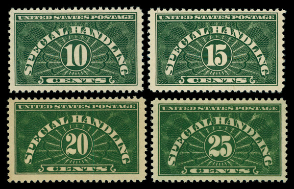 9285 nh QE1-QE4 imageSpecial Handling, 1925-28, 10¢ to 25¢ complete (Scott QE1-QE4), o.g., never hinged, Very Fine.