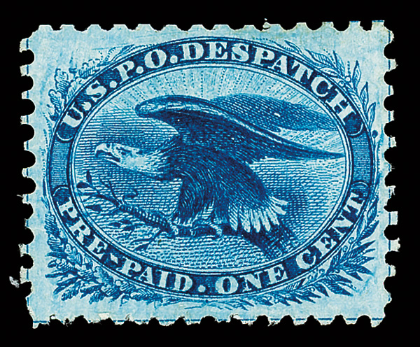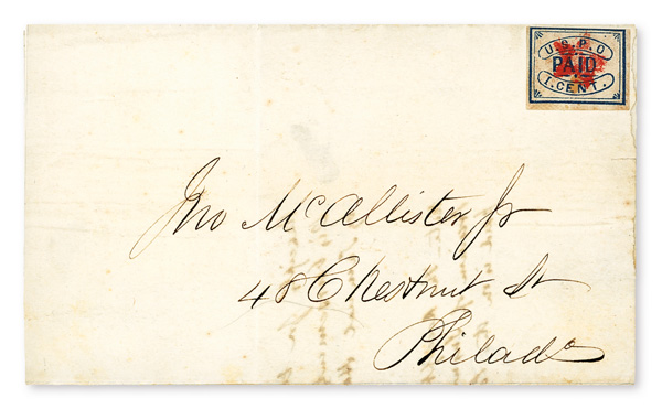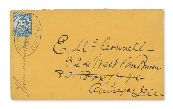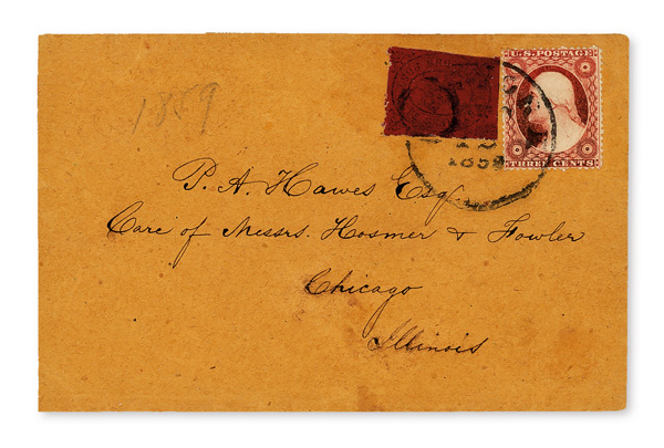 9310 cover 68L1 imageFloyd's Penny Post, 1860 (1¢) blue (Scott 68L1), tied by neat strike of "Floyd's Chicago Penny Post" oval handstamp on orange locally addressed cover (addressed changed by sender prior to giving to Floyd's); stamp with small pre-used nick in bottom right corner, otherwise a Very Fine cover, with 2013 P.F. certificate.