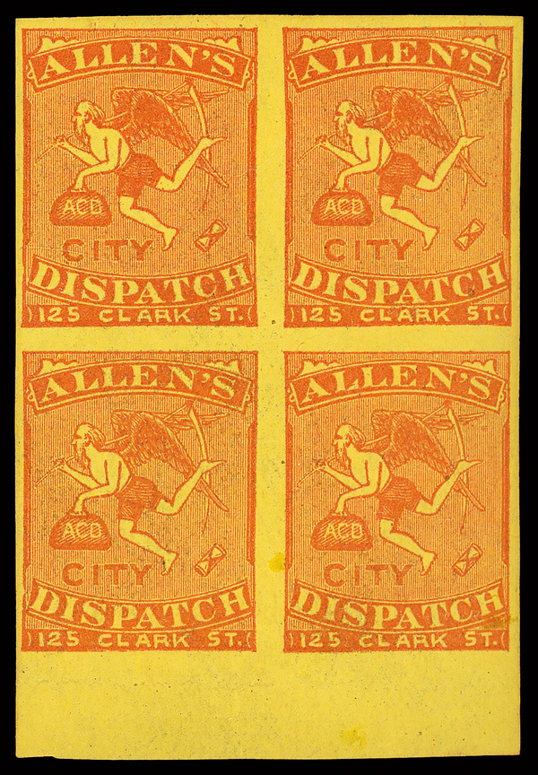9297 nhbl 3L3a imageAllen's City Dispatch, 1882, red on yellow, imperf (Scott 3L3a), bottom margin block of 4, o.g., never hinged, sound with both ink and paper bright; clear to ample margins all around; couple tiny inclusions and spots of gum on face, otherwise fresh, still Very Fine.