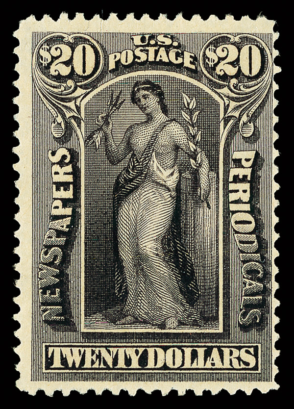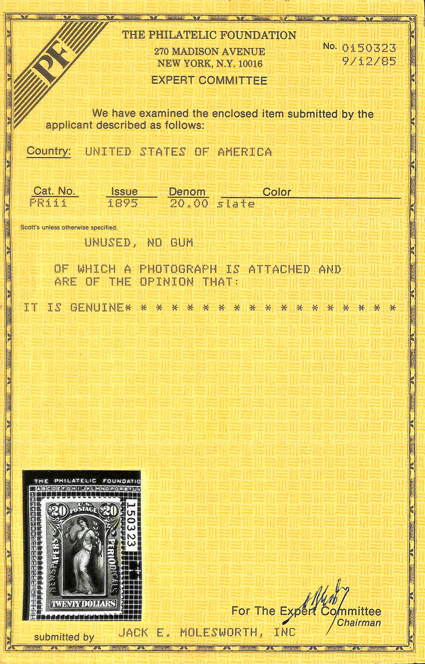 9283 ng PR111 imageNewspaper, 1895, $20 slate, Bureau printing, unwatermarked (Scott PR111), unused without gum, gorgeous deeep dark shade and proof quality impression, Fine to Very Fine, with 1985 P.F. certificate.