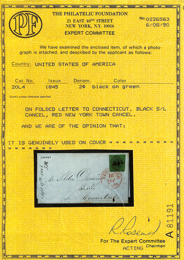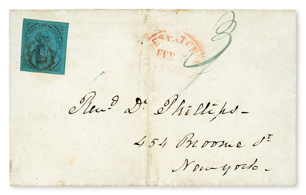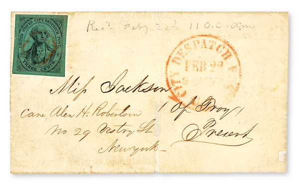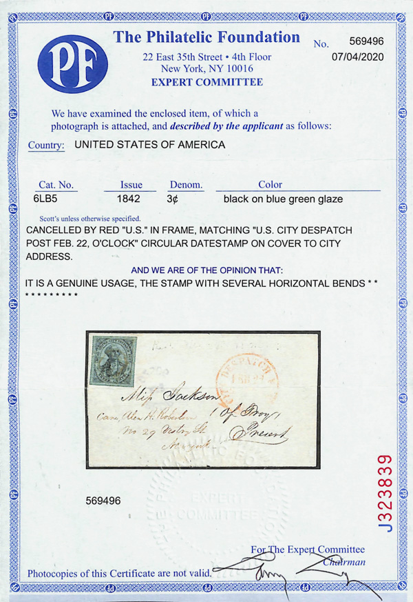 9289 cover 6LB5 imageNew York, N.Y., U.S. City Despatch Post, 1842-45, 3¢ black on blue green (Scott 6LB5), large margins all around, cancelled by red octagonal "U.S." handstamp, matching "U.S. City Despatch Post Feb. 22 8 O'Clock" circular datestamp on folded outer address sheet to "Miss. Jackson of Troy" at her local street address in New York City; central vertical file fold clear of stamp and marking, stamp with "several horizontal bends", Fine to Very Fine, other pencil notes on back indicate it appeared in a 1956 Mozian sale, ex Knapp (1941 sale), with 2020 P.F. certificate.