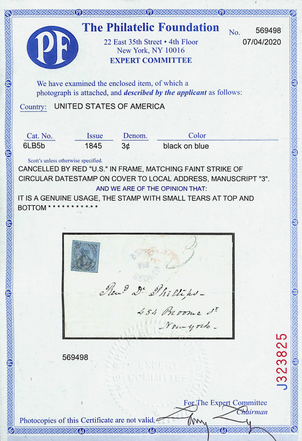 9291 cover 6LB5b imageNew York, N.Y., U.S. City Despatch Post, 1842-45, 3¢ black on blue (Scott 6LB5b), full to large margins, cancelled by red octagonal "U.S." handstamp, matching faint strike of "U.S. City Despatch Post Feb. 2? ? O'Clock" circular datestamp on locally addressed folded outer address sheet with 1845 docketing, manuscript "3" at top; stamp with 2 small tears, central vertical file fold clear of stamp, still Fine to Very Fine, with 2020 P.F. certificate.