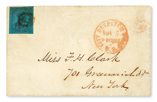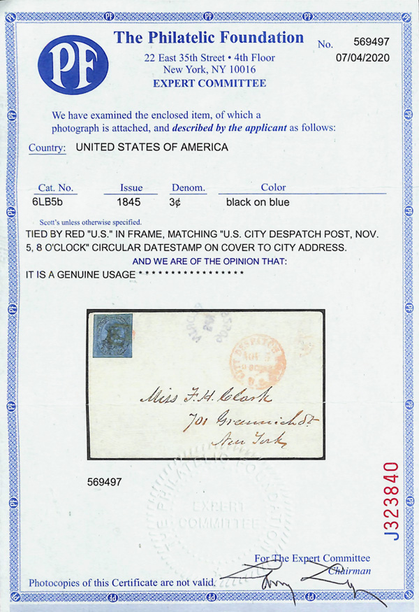 9290 cover 6LB5b imageNew York, N.Y., U.S. City Despatch Post, 1842-45, 3¢ black on blue (Scott 6LB5b), full to large margins, cancelled by red octagonal "U.S." handstamp, matching "U.S. City Despatch Post Nov. 5, 8 O'Clock" circular datestamp on locally addressed cover, Very Fine, with 2020 P.F. certificate.