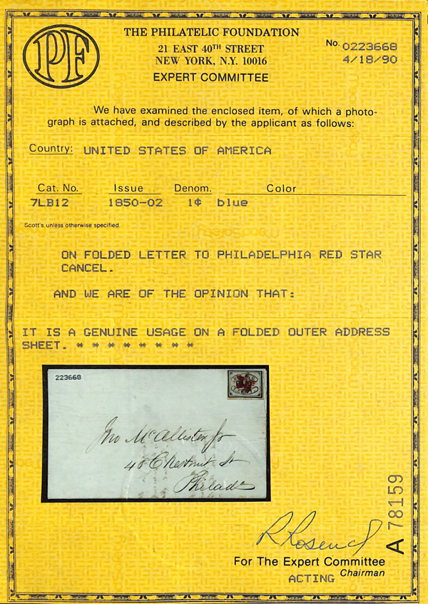 9295 cover 7LB12 imagePhiladelphia, Pa., U.S.P.O. Despatch, 1850-52, 1¢ blue (Scott 7LB12), large margins at right and bottom, full to touched at top, strong strike of red star cancel, on locally addressed folded letter sheet, Very Fine, ex Kuphal, with 1990 P.F. certificate.