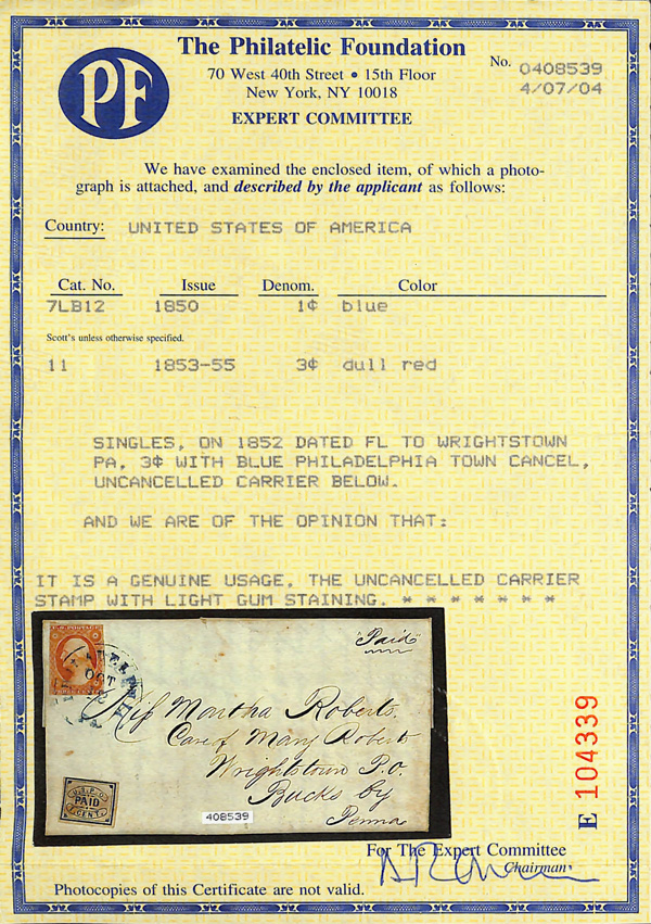 9294 cover 7LB12 imagePhiladelphia, Pa., U.S.P.O. Despatch, 1850-52, 1¢ blue (Scott 7LB12), large margins at bottom and right, ample at top and left, uncanceled but tied by light gum soak thru, and 3¢ dull red (Scott #11) tied by blue "Philadelphia Pa. Oct. 12" circular datestamp on folded letter with October 10th 1852 docketing, manuscript "Paid" at top right, addressed to Wrightstown PA, Very Fine, with 2004 P.F. certificate.