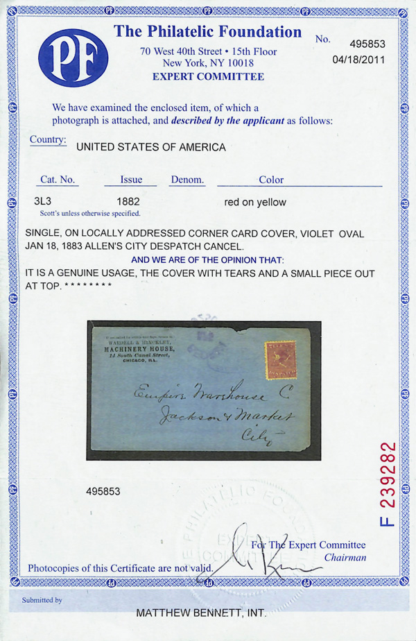 9296 cover 3L3 imageAllen's City Dispatch, 1882, red on yellow (Scott 3L3), tied by purple "Allen's City Despatch, 123 Clark Street, Jan. 4, 1882" oval datestamp on locally addressed corner card cover; cover faults clear of stamp and marking, still Very Fine and very scarce, with 2011 P.F. certificate.