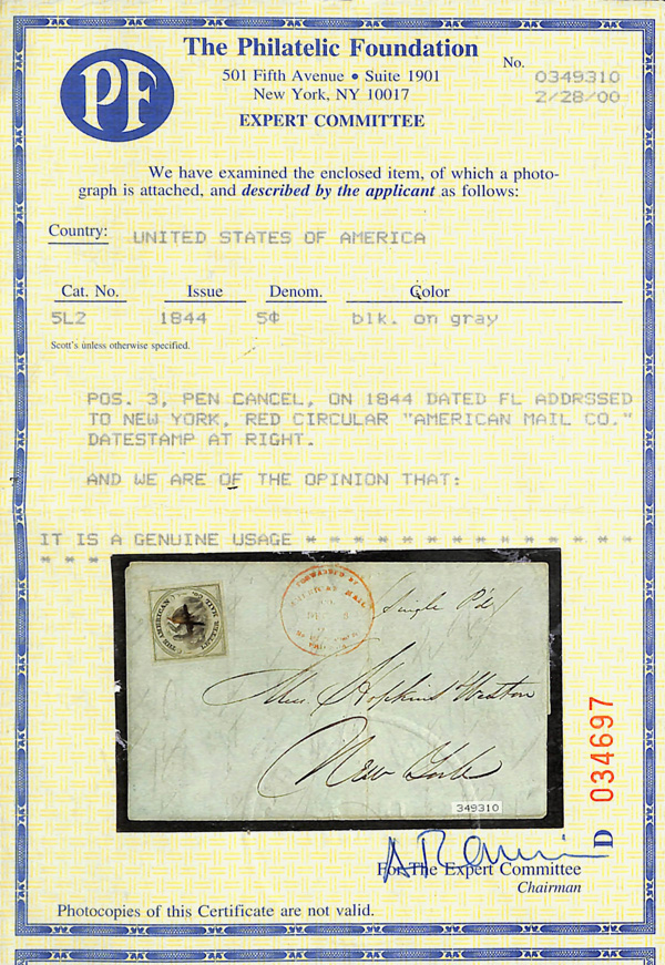 9298 cover 5L2 imageAmerican Letter Mail Co., 1844, black on gray (Scott 5L2), position 3, large even margins all around, manuscript "X" cancel, red "Forwarded by American Mail Co. from No. 101 Chestnut St. Philada. Dec. 3" circular datestamp on folded letter datelined "Phil. Dec. 3/(18)44" to New York City, Extremely Fine, the dated circle cancel is scarce, ex Frajola, Dr. Puliafito and Field, signed Frajola, with 2000 P.F. certificate.