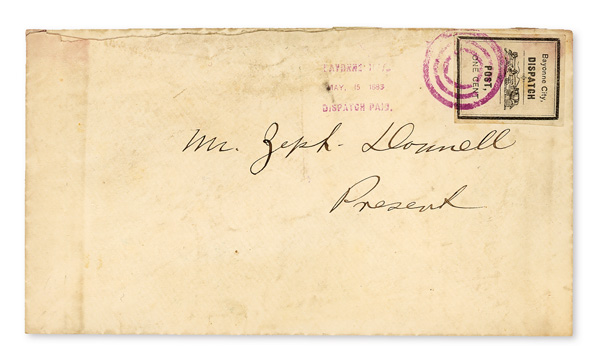 9292 cover 7LB11 imagePhiladelphia, Pa., U.S.P.O. Despatch, 1850-52, 1¢ gold on black (Scott 7LB11), ample at top right, large margins everywhere else, red star cancel, on locally addressed brown cover, with original Oct. 30, 1851 statement sized letter asking if the client intends to appeal, auction lot description affixed to reverse, Extremely Fine, this stamp is found on covers between April 1851 and February 1852, and the red star cancel was first used in mid October 1851, ex Meyersburg.