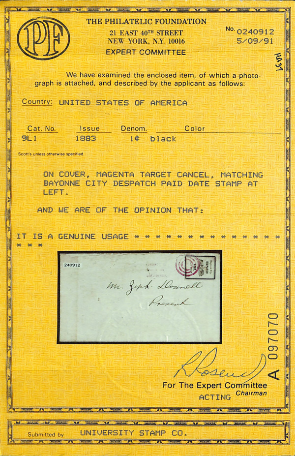 9299 cover 9L1 imageBayonne City Dispatch, 1883, 1¢ black (Scott 9L1), turned sideways as always, full to large margins, tied by magenta target cancel with matching "Bayonne City, May, 15, 1883, Dispatch Paid" 3-line datestamp on locally addressed cover, Fine, with 1991 P.F. certificate.