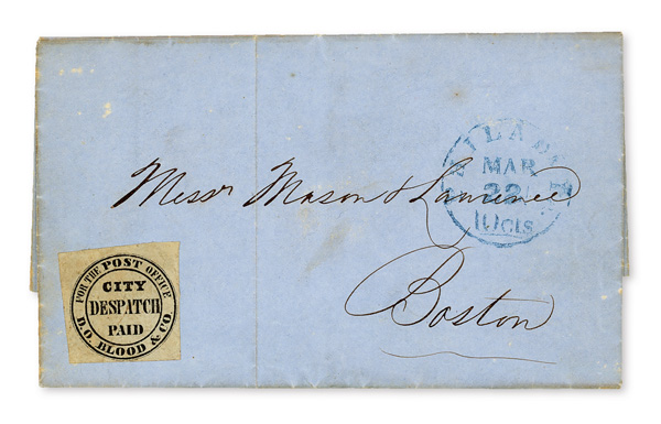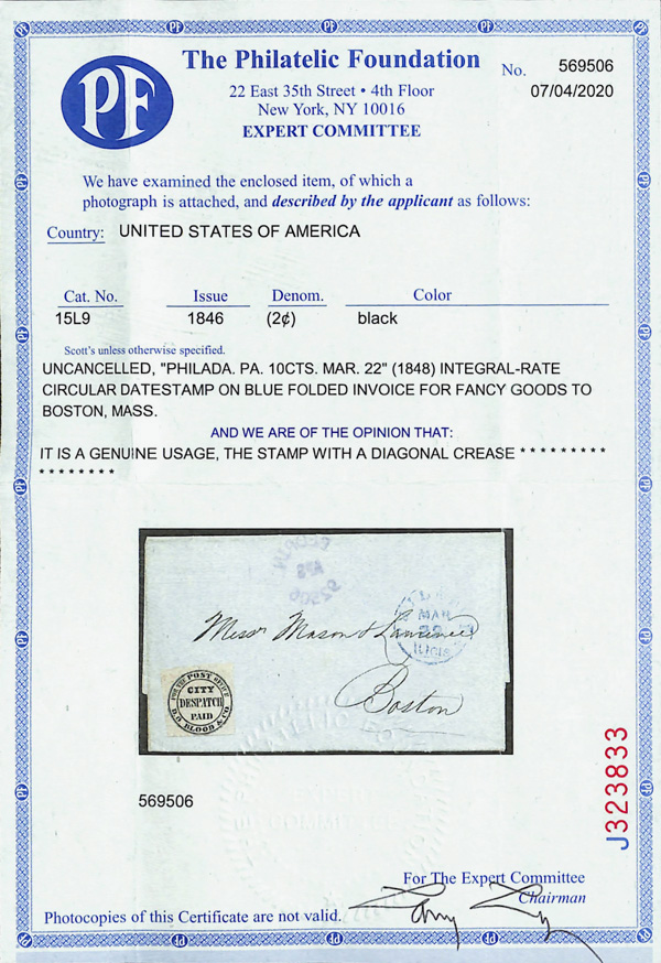 9300 cover 15L9 imageBlood & Co., 1846-47 (2¢) black (Scott 15L9), ample to large margins all around and uncancelled on blue 1848 folded invoice for fancy prints (PF says goods) to Boston, blue "Philada. Pa. 10cts. Mar. 22" integral-rate circular datestamp at top right; diagonal crease (appears to be pre use), Very Fine, with 2020 P.F. certificate.