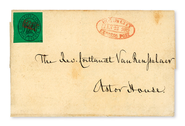 9301 cover 20L2 imageBoyd's City Express, 1844, 2¢ black on yellow green (Scott 20L2), huge sheet margin at left and large margin with frameline at right, red "Free" handstamp with matching red "Boyd's City Express Post Jan 22 9 O'C" (O'clock) oval handstamp at top center, on undated folded letter (but certainly 1845), addressed to "Rev. Cortlandt Van Rensselaer, Astor House", Extremely Fine, This is definitely 1845. The stamp was issued in 1844, the letter is datelined simply "Tuesday night", and the only year between 1844 and 1848 where Jan. 22 was a Wednesday was 1845., with 2018 P.F. certificate.