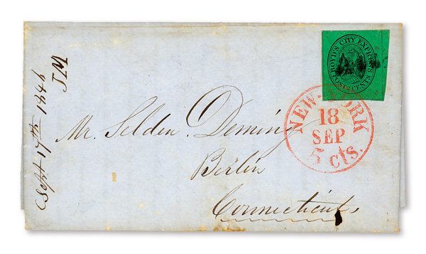 9302 cover 20L4 imageBoyd's City Express, 1845, 2¢ black on green (Scott 20L4), 3 framelines including huge margin at right, black cancel and tied by red "New-York 5cts. 18 Sep." integral-rate circular datestamp on blue folded letter datelined and docketed Sep 17th 1846 to Berlin CT, Very Fine, with 1990 P.F. certificate.