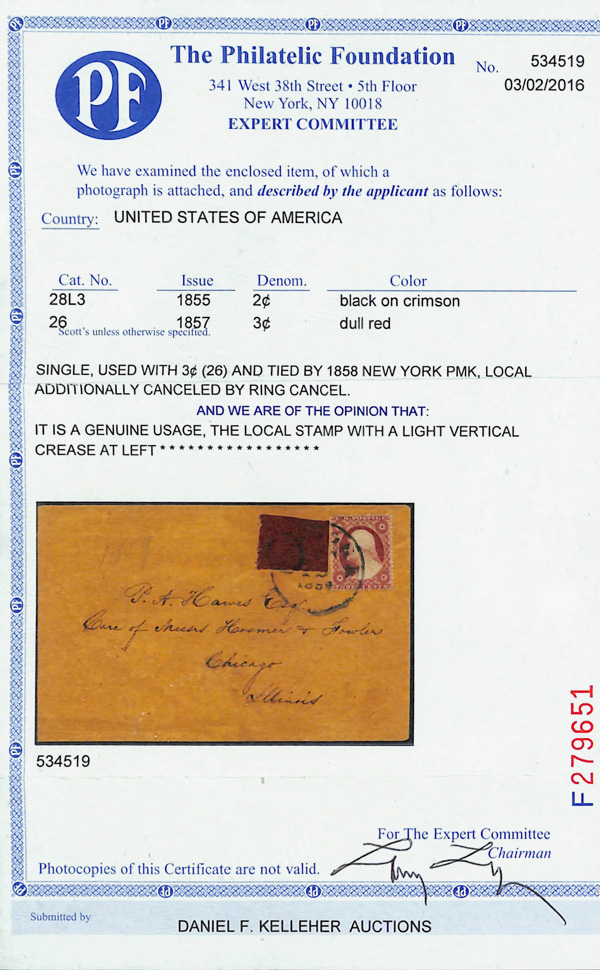 9304 cover 28L3 imageBrooklyn City Express Post, 1855-64, 2¢ black on crimson, used with 3¢ Rose 1857 Ty. II (Scott #26) (Scott 28L3), local with ring cancel and both stamps tied by New York City 1858 circular datestamp on cover addressed to Chicago; reduced at left, still Very Fine. (Image) (Image2) (All Images)