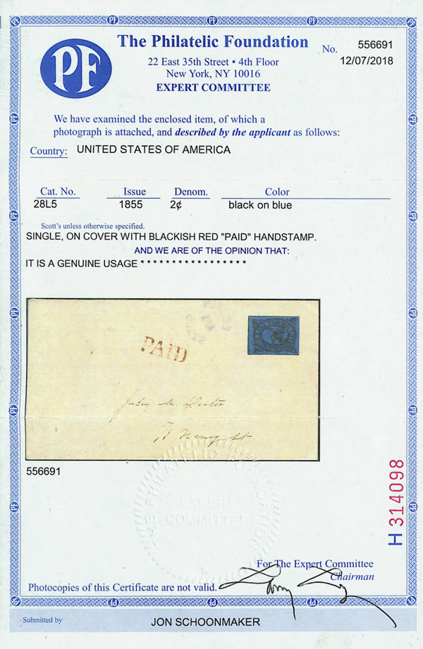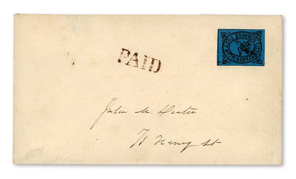 9305 cover 28L5 imageBrooklyn City Express Post, 1855-64, 2¢ black on dark blue (Scott 28L5), full framelines on 3 sides, cancelled but not tied on locally addressed cover, well-struck blackish red "PAID" handstamp at center; tiny sealed tear at top from opening so tiny it wasn't mentioned on the cert, Very Fine, signed Sloane "28L5 original and used on this cover", with 2018 P.F. certificate.