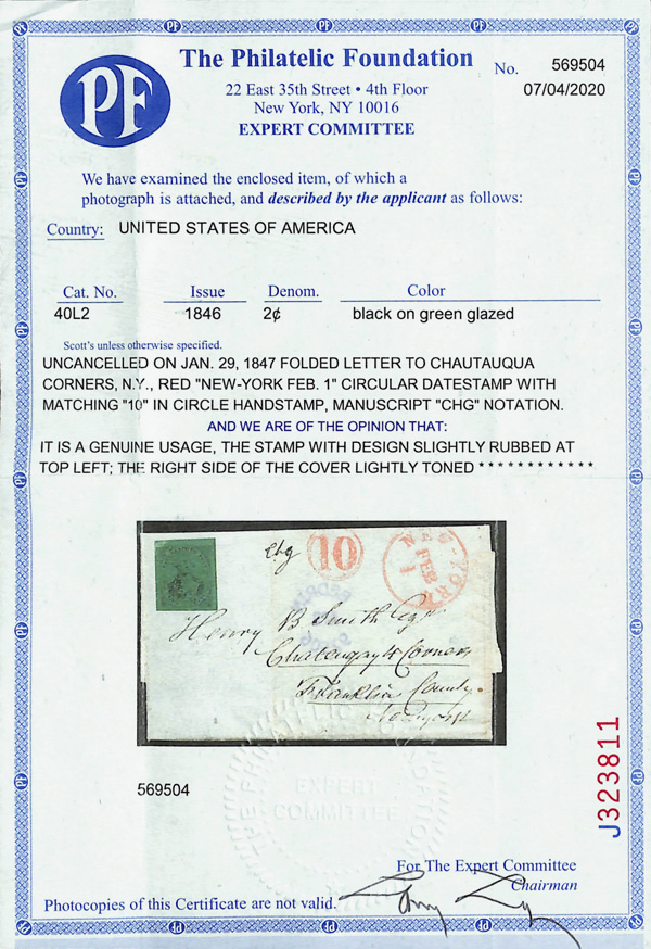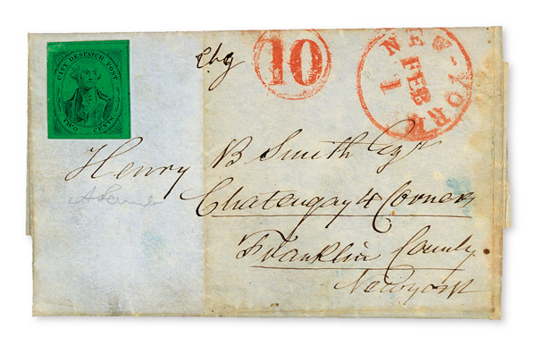 9307 cover 40L2 imageCity Despatch Post, 1847, 2¢ black on green (Scott 40L2), large to huge margins all around, uncancelled on Jan. 29, 1847 folded letter to Chautauqua Corners NY, red "New-York Feb. 1" circular datestamp with matching "10" in circle handstamp to its left and manuscript "Chg" (Charge) to its left; stamp very slightly rubbed in the top left margin & right side of cover slightly toned, still Very Fine, with 2020 P.F. certificate.