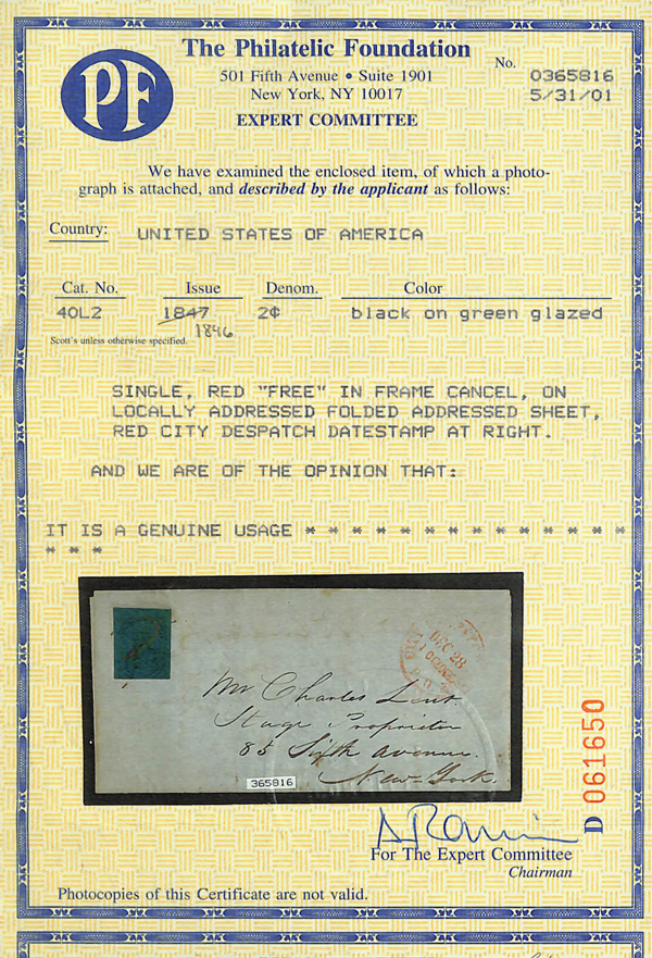 9306 cover 40L2 imageCity Despatch Post, 1847, 2¢ black on green (Scott 40L2), huge margin with full frameline at top, large margins at sides, just touched at bottom, red "Free" in frame handstamp cancel, matching "City Despatch Post P.O. Dec. 28, 1 O'Clock" (most likely 1846) circular datestamp on folded locally addressed outer sheet to the Stage Proprietor at 85 Sixth Ave, Very Fine, ex Hall, with 2001 P.F. certificate.