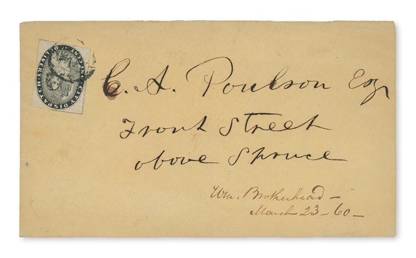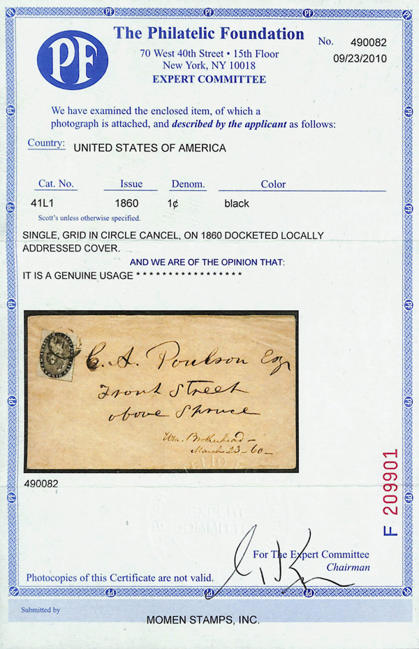 9308 cover 41L1 imageCity Dispatch, Philadelphia, Pa., 1860, 1¢ black (Scott 41L1), clear to ample margins and tied by grid in circle cancel on locally addressed cover docketed Mar. 23, 1860 at bottom; small insignificant sticker on back, Very Fine, ex Golden (where it sold for $600 hammer), with 2010 P.F. certificate.