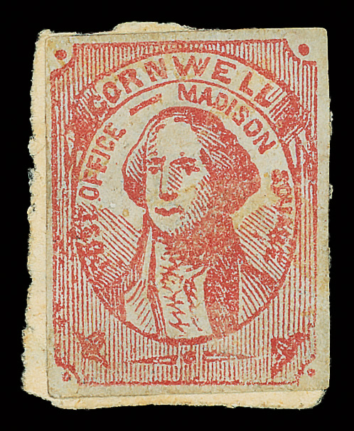 9309 og 52L1 imageCornwell's Madison Square Post Office, 1856 (1¢) red on blue (Scott 52L1), ample to full margins all around, affixed to small stamp sized piece (appears to be a ledger page), with 2017 P.F. certificate.