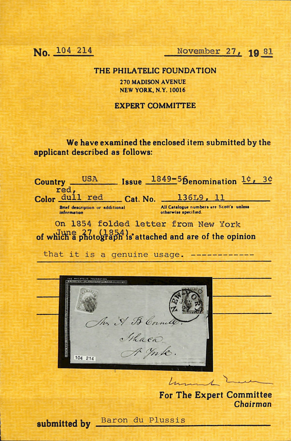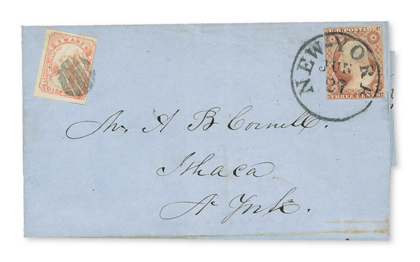 9312 cover 136L9 imageSwart's City Dispatch Post, 1849-53 (1¢) red, on cover with 3¢ dull red Type II (#11A) (Scott 136L9), local with three huge margins but into at right and tied by perfectly struck small 5 bar grid cancel, 3¢ with ample margins to just into at bottom and tied by "New-York Jun. 27" circular datestamp on 1854 folded letter addressed to "A.B. Cornell, Ithaca NY", Extremely Fine, There is at least one other cover with the same franking to A.B. Cornell, with 1981 P.F. certificate stating #11 which it is not (there was no distinction made in 1981).