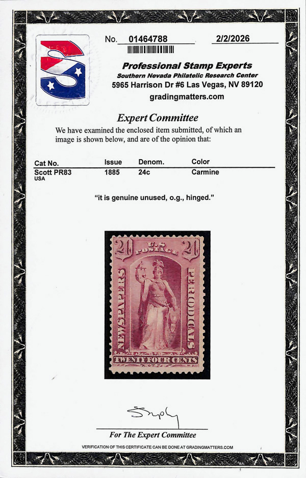 9282 og PR83 imageNewspaper, 1885, 24¢ carmine, A.B.N.C. printing (Scott PR83), o.g., hinged, clean and sound with robust color and clear impression, Fine, with 2026 P.S.E. certificate.