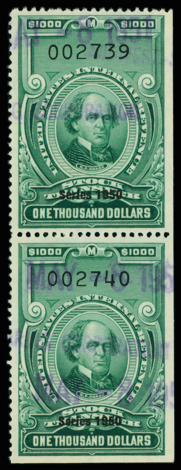 9323 O RD335 imageStock Transfer, 1950, $1,000 Chase (Scott RD335), vertical pair, Very Fine.