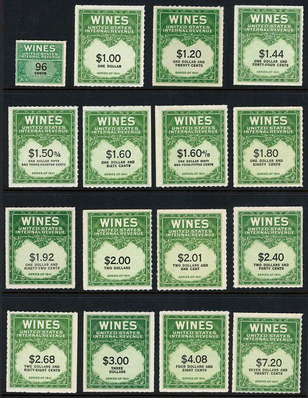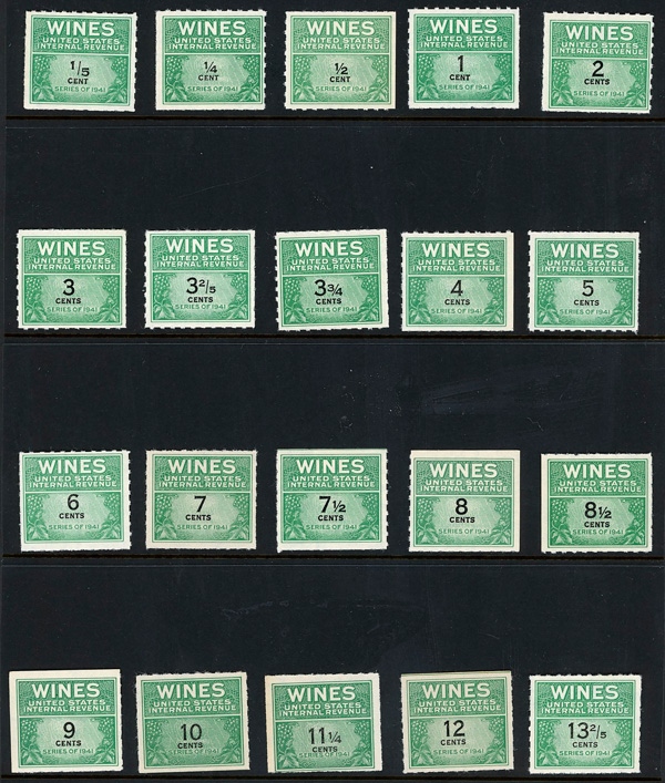 9324 ng RE108//RE203 imageWine Stamps, 1942-54, 1/5¢-$20.00 (Scott RE108//RE203), selection of 59 different, without gum as issued, Fine to Very Fine.