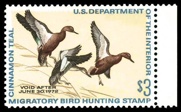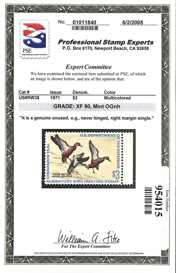 9351 nh RW38 imageFederal Duck Stamp, 1971, $3 Cinnamon Teals (Scott RW38), o.g., never hinged, Extremely Fine, with 2005 P.S.E. certificate graded XF 90.