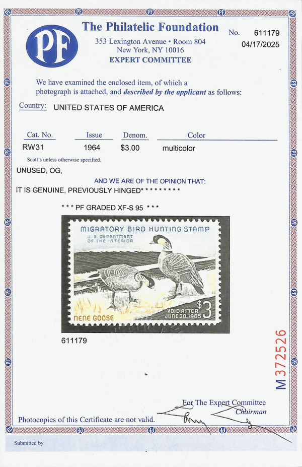9348 og RW31 imageFederal Duck Stamp, 1964, $3 Nene Geese (Scott RW31), o.g., lightly hinged, Extremely Fine to Superb, with 2025 P.F. certificate graded XF-SUP 95.