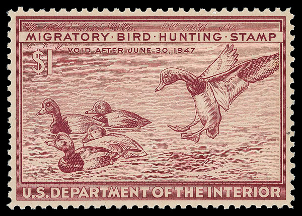 9334 nh RW13 imageFederal Duck Stamp, 1946, $1 Redhead Ducks (Scott RW13), o.g., never hinged, Extremely Fine.
