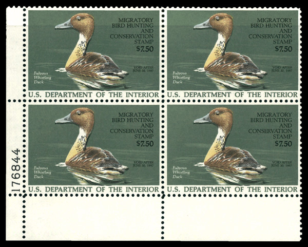 9355 nhbl RW53 imageFederal Duck Stamp, 1986, $7.50 Fulvous Whistling Duck (Scott RW53), plate block of 4, o.g., never hinged, Extremely Fine.