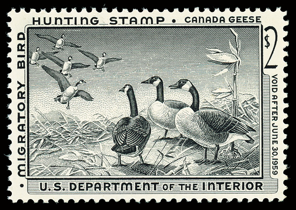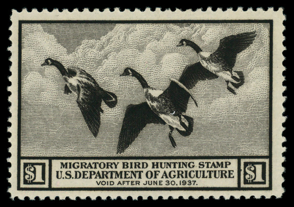 9330 nh RW3 imageFederal Duck Stamp, 1936, $1 Canada Geese (Scott RW3), o.g., never hinged (minor gum skips), Fine to Very Fine.