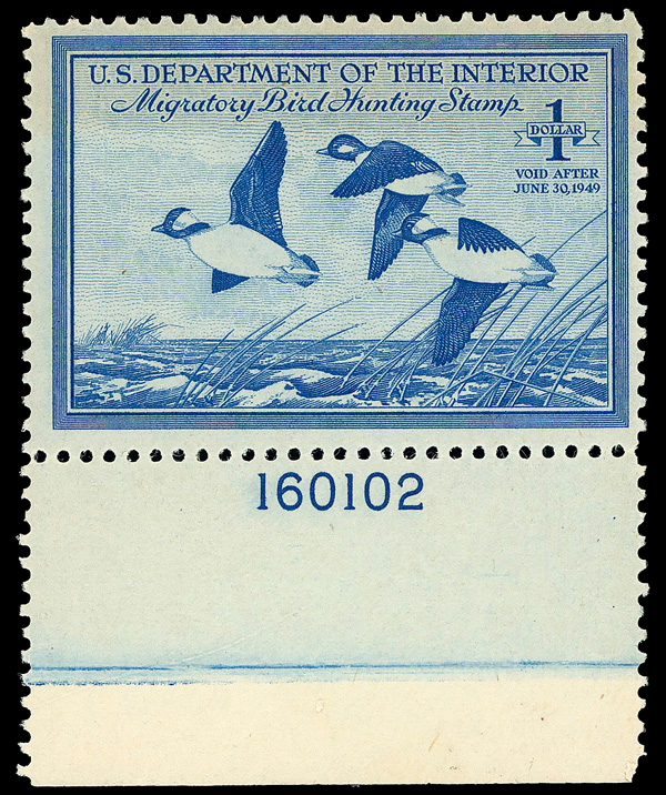 9335 nh RW15 imageFederal Duck Stamp, 1948, $1 Buffleheads (Scott RW15), plate number single, o.g., never hinged, Fine to Very Fine.