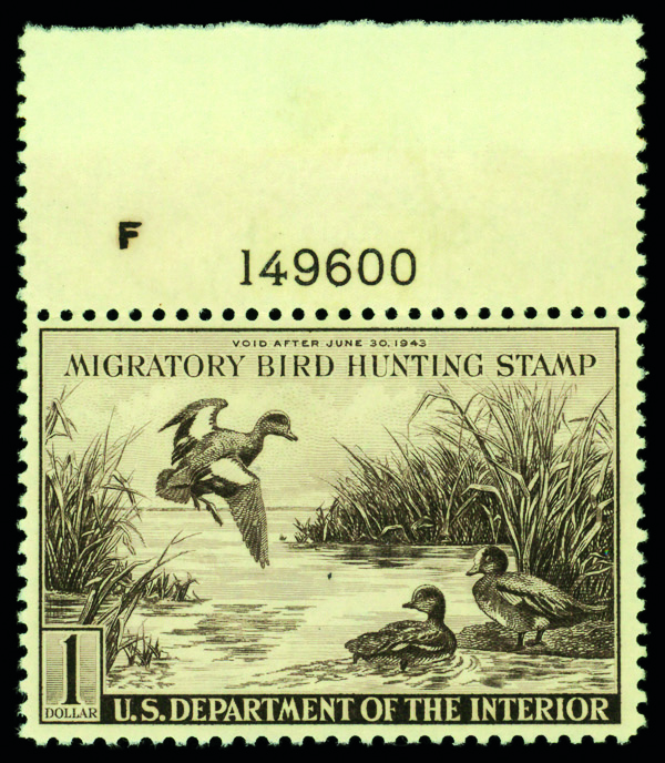 9331 nh RW9 imageFederal Duck Stamp, 1942, $1 Baldpates (Scott RW9), plate number single, o.g., never hinged, Fine to Very Fine.