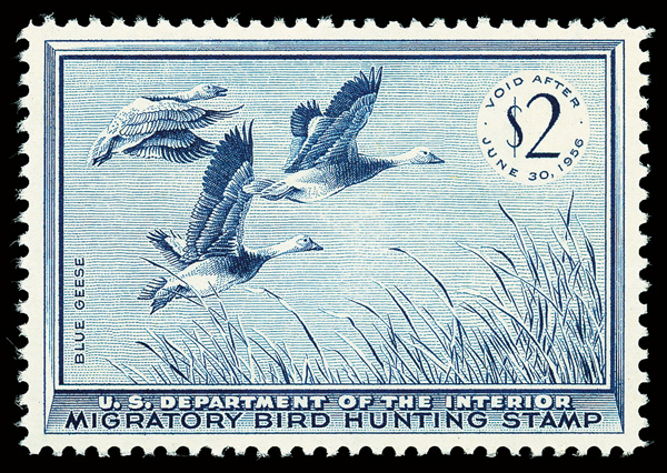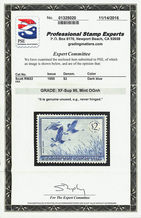 9338 nh RW22 imageFederal Duck Stamp, 1955, $2 Blue Geese (Scott RW22), o.g., never hinged, Extremely Fine to Superb, with 2016 P.S.E. certificate graded XF-SUP 95.